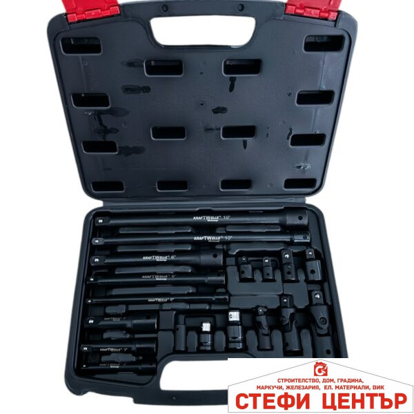 Комплект ударни преходници и удължения 18 части – 1/4″,3/8″, 1/2″ KraftWelle