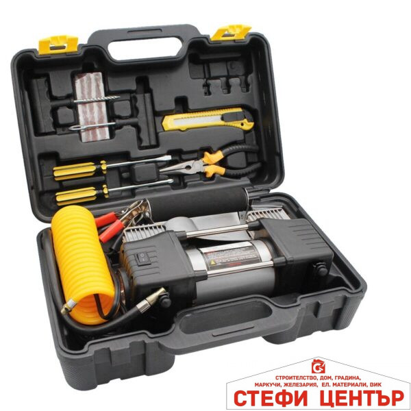 КОМПЛЕКТ “ПЪТНА ПОМОЩ” – КОМПРЕСОР ЗА ГУМИ с LED фенер С МАРКУЧ ЗА ВЪЗДУХ И ИНСТРУМЕНТИ
