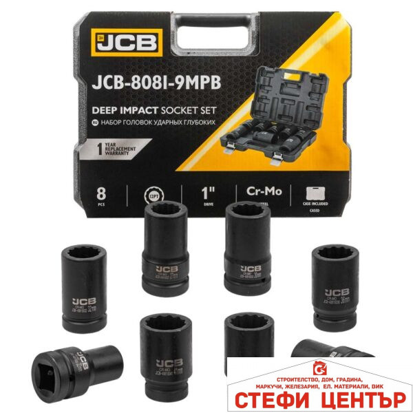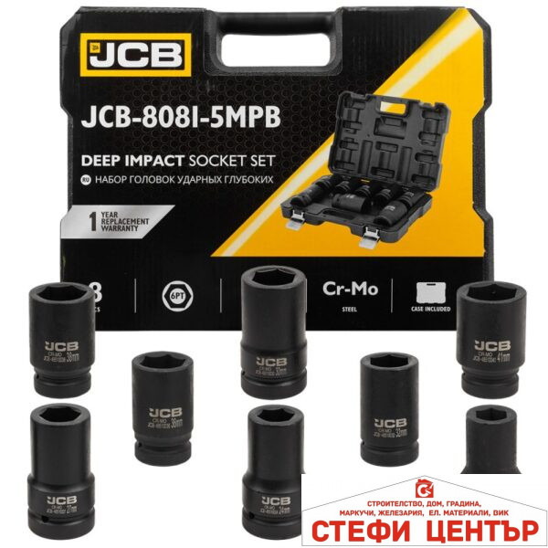 КОМПЛЕКТ ДЪЛБОКИ УДАРНИ ВЛОЖКИ 6-СТЕННИ 1″ (22 – 41 ММ) 8 ЧАСТИ JCB 8081-5MPB