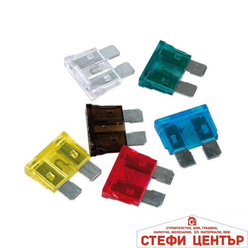 Ножовиден автомобилен предпазител с номинален ток: 10А, 15А, 20А, 25А, 30А.