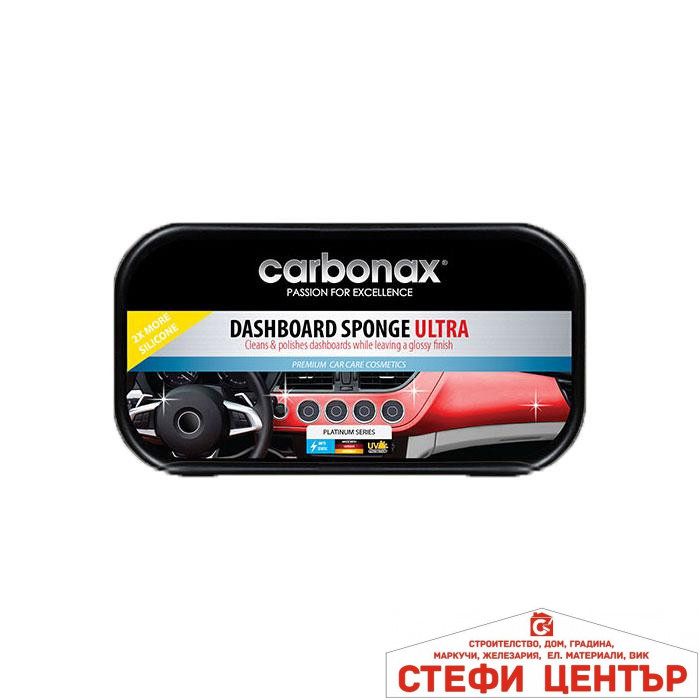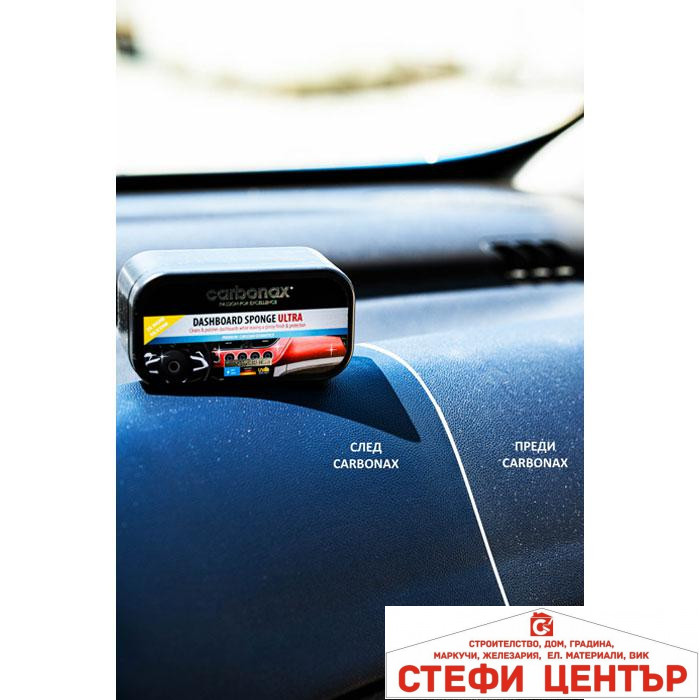 Два пъти повече състав за още по-силен блясък и дълготрайна защита на автотаблото!  Гъба за автостъкла Carbonax ултра елиминира наслоените замърсявания по таблото и интериора на автомобила и оставя блестящ завършек! Формулата с двоен състав създава предпазен слой, предотвратяващ напукване, надраскване и избледняване на цвета, в следствие на UV-лъчите. Приятен и дълготраен аромат след употреба. Безопасна за почистване и полиране на пластмаса, гумени детайли, кожени салони (естествена и изкуствена кожа) и др. Подходяща за регулярна употреба.