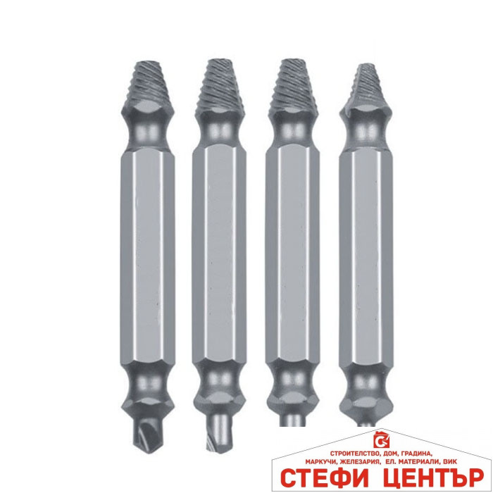 Комплекта съдържа 4 стоманени екстрактора с по 2 глави.