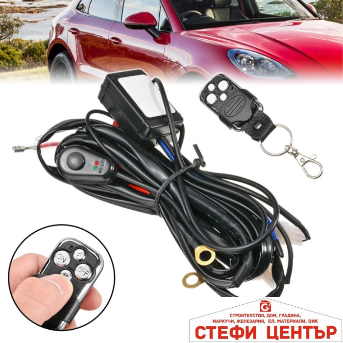 Комплект окабеляване за лед барове ,Фарове и други ,с кабелни обувки ,предпазител ,реле и ключ – прекъсвач с led индикация за включени и изключени светлини.