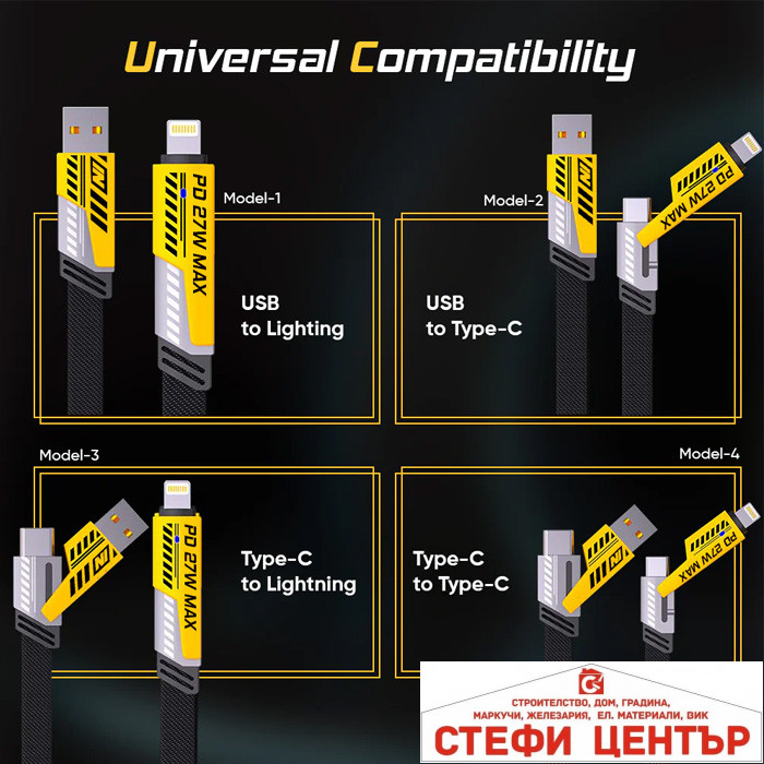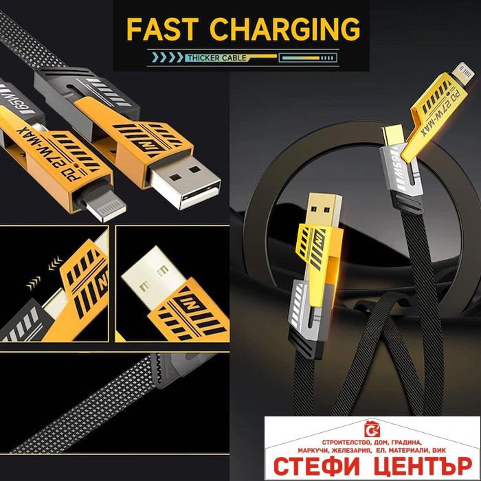 Поддържа: USB към Lightning, Type-C към Type-C, USB към Type-C, Type-C към Lightning