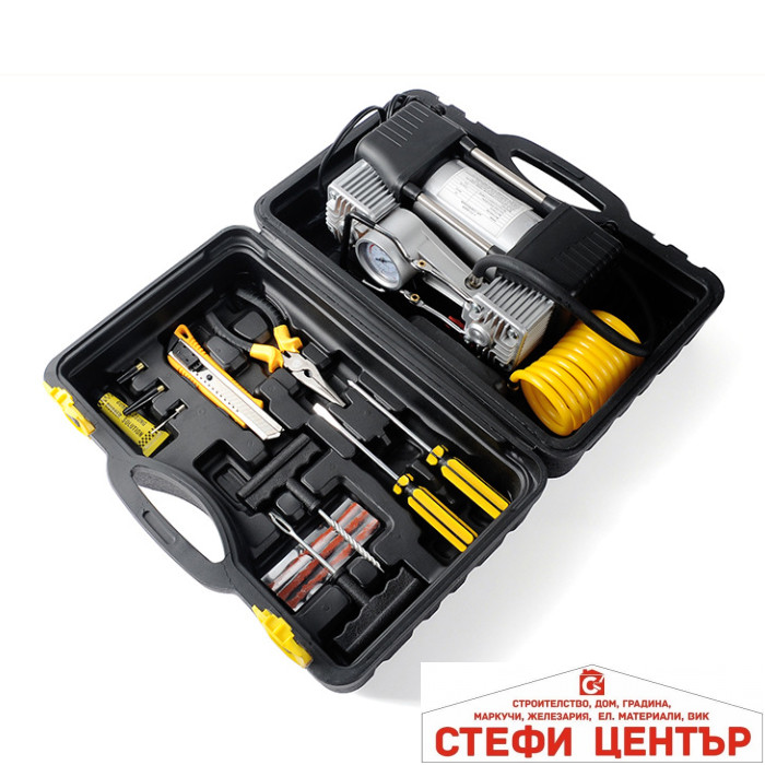 Двуцилиндров компресор с манометър и спираловиден маркуч, осигуряващ много бързо помпене на гуми на автомобили и различни надуваеми продукти като лодки, дюшеци, басейни, топки и др.Характеристики:Захранване : с щипки за акумулатор, както и букса за запалка 3 метра.Волтаж: 12VМакс. ампераж: 30AМаксимално работно налягане: 11 бара.Дебит: 55 л/мин.2 цилиндъра с диаметър: 30 мм.Макс. работен цикъл: 20 мин.Спираловиден подсилен маркуч с бърза връзка и манометър: дължина 5 м.Комплект от накрайници за надуване на различни надуваеми продукти: 3 бр.Компресора разполага със специално куфарче за съхранение на целия комплект.Предпазител / бушон.Бутон за включване / изключване.1бр. Въздушен компресор 12V за помпане на гуми, надуваеми дюшеци, топки за игра и други.1бр. Куфар.1бр. Макетен нож.1бр. Клещи.1бр. Кръстата отвертка.1бр. Права отвертка.2бр. Шило.3бр. Накрайници за помпане.3бр. Фитили (пури) за лепене на гуми.1бр. Лепило за лепене на гуми.Техн. параметри: работно напрежение 12-13.5V, максимален ток 23А, максимално работно налягане 150 PSI, капацитет 85L/min.
