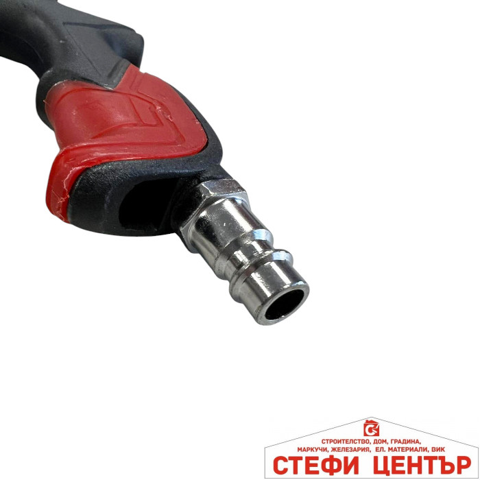 Пистолет за въздух с вграден манометър, предназначен за бързо и точно контролиране на налягането при напомпване, изпомпване и инспекция на гуми, въздушни балони, амортисьори и други приложения в автосервизи, работилници и гаражи.