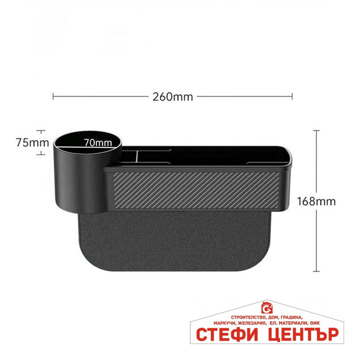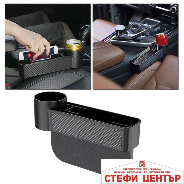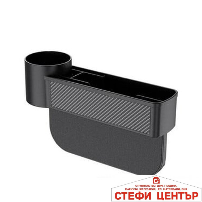 Органайзер създаден да пасне между почти всички автомобилни седалки и централни конзоли, този аксесоар ви помага да организирате вещите си в интериора на автомобила. Разполага с отделение за чаша/бутилка и няколко отделения за други предмети – като телефон, слънчеви очила, карти, зарядни кабели и други.