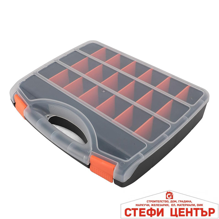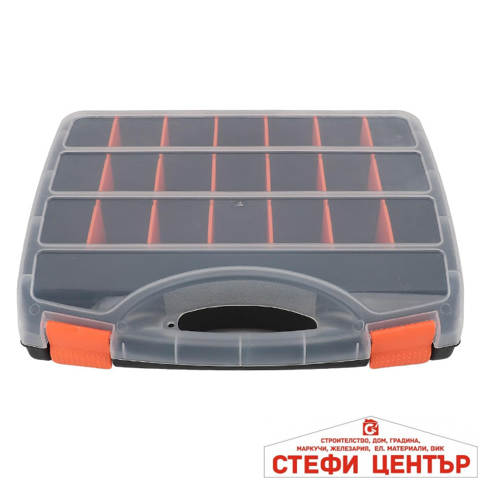 Функционален и удобен органайзер с 21 отделения, създаден за подреждане и съхранение на дребни инструменти, крепежни елементи и аксесоари. Благодарение на прозрачния капак и практичната конструкция, винаги имате ясен преглед и лесен достъп до съдържанието.