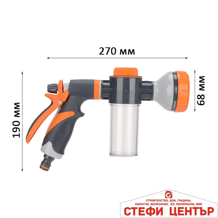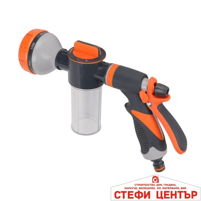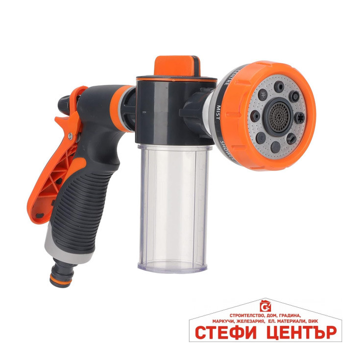 Този многофункционален пистолет за маркуч е практичен и надежден помощник за всяка градина и домакинство. С 8 регулируеми режима на пръскане (от фина мъгла до силна струя) лесно ще адаптирате водния поток спрямо нуждите — поливане на цветя, изплакване на тераси, миене на автомобил или силна струя за упорити замърсявания. Вграденият прозрачен контейнер за препарат дава възможност за директно дозиране и смесване на почистващи средства, което спестява време и усилия.