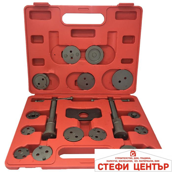 Професионален комплект от 18 части за сваляне на спирачни цилиндри, необходими за ремонт на превозни средства, оборудвани с дискови спирачки.