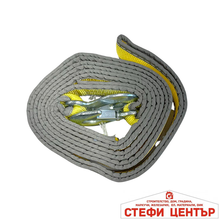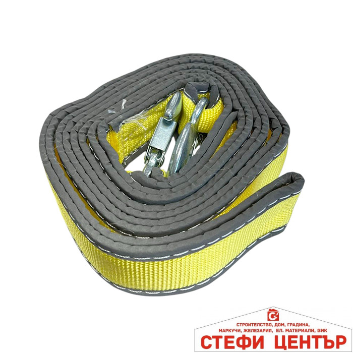 Висококачествен колан за теглене, изработен от усилен полиестер с изключителна здравина и издръжливост. Предназначен за безопасно теглене на автомобили и лекотоварни превозни средства с максимално тегло до 6 тона. Дължината от 4 метра осигурява оптимално разстояние между автомобилите, а светлоотразителните елементи гарантират отлична видимост дори при намалена осветеност или нощно време, което повишава безопасността при работа на пътя.