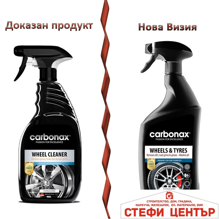Спрей за почистване на джанти Carbonax – 720мл.Wheel Cleaner е специално разработен препарат за цялостното им почистване. Щадяща джантите формула, без агресивни киселини и без амоняк! Активните съставки с лекота премахват мръсотията – спирачен прах, кал, мазнини, грес и много други. Резултатът – блестящи джанти с огледален финиш! Оставя приятен аромат. Подходящ за хромирани/частично хромирани, алуминиеви и лети джанти.