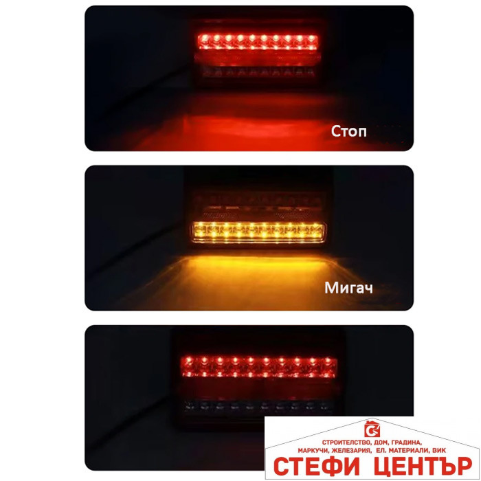 LED комбиниран стоп, предназначен за ремаркета, каравани, кемпери, камиони и други превозни средства. Светлината съчетава стоп, мигач и габарит в един компактен корпус.