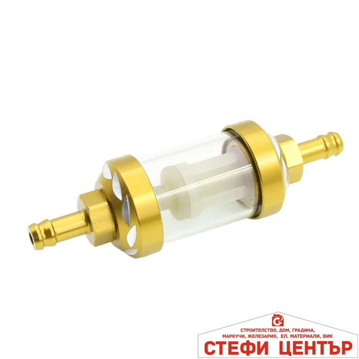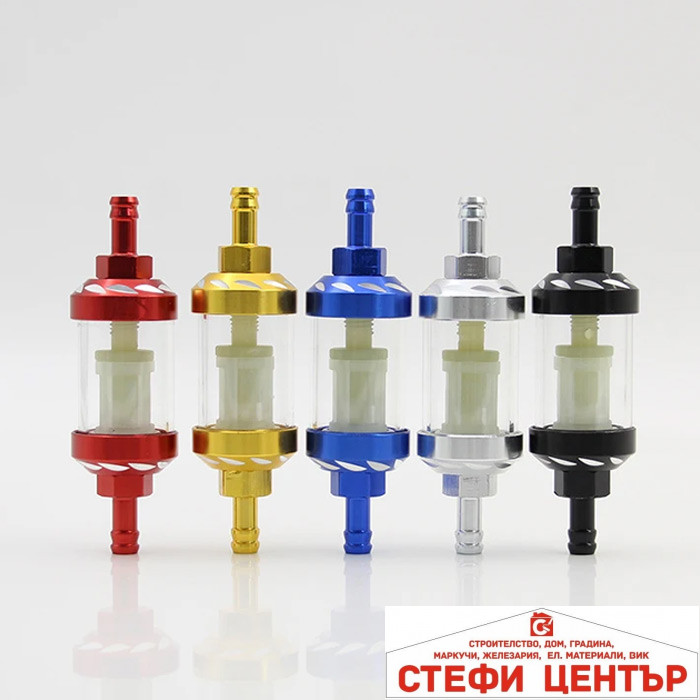 Универсален горивен филтър за бензин с прозрачен корпус и алуминиеви накрайници, подходящ за монтаж по горивната линия на мотоциклети, ATV, мотокрос мотори, пит байкове и др. Поддържа тръби с вътрешен диаметър 8 мм.