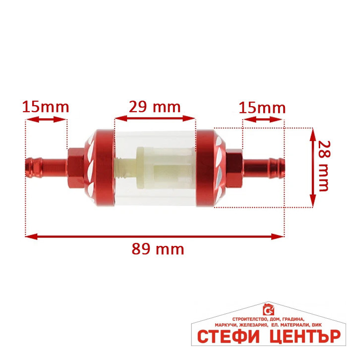 Тип монтаж: Вграждане по горивната линия (inline) – просто поставяне между два маркуча с подходящи скоби